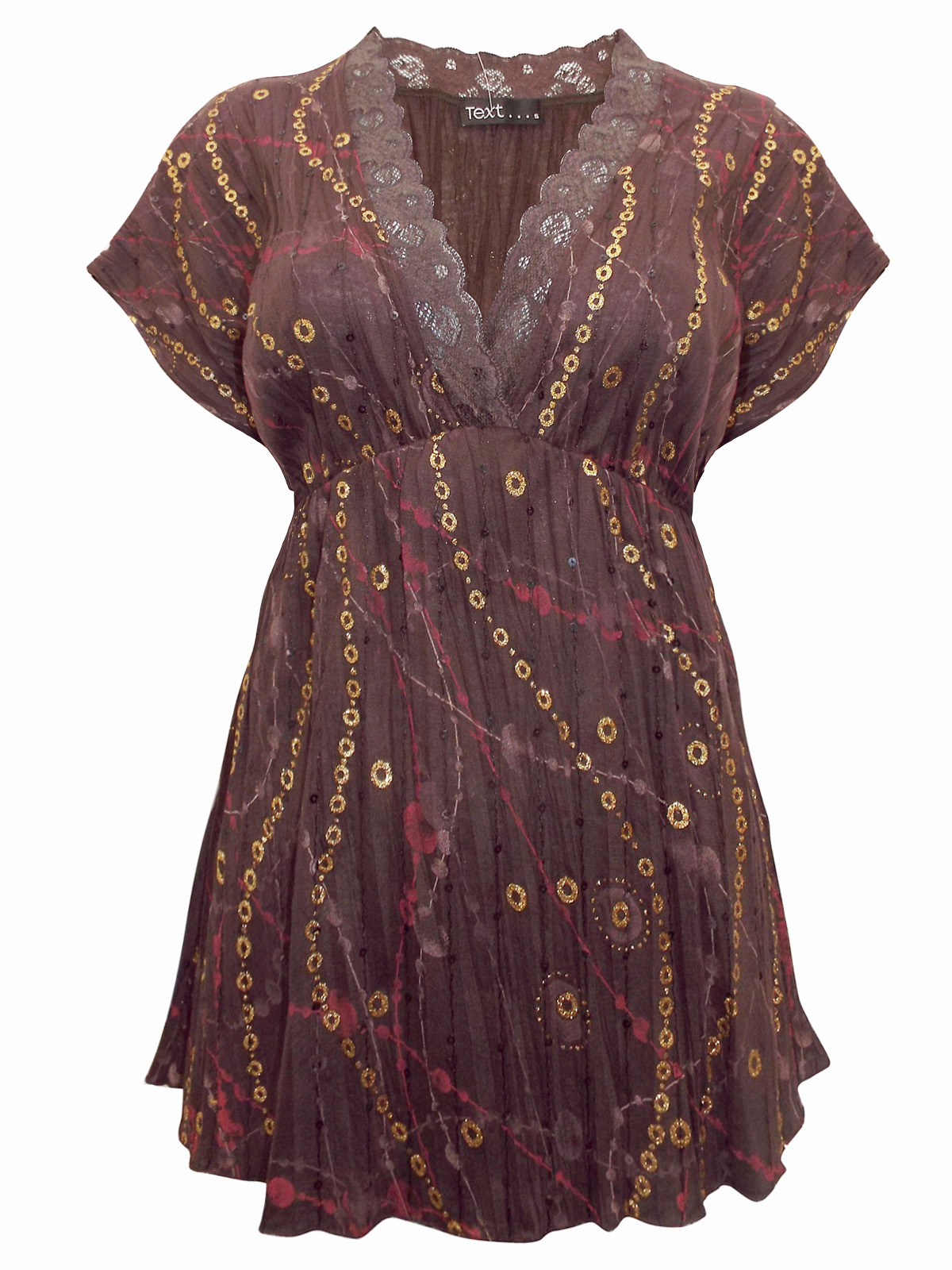 - barva: hnědá se zlatým potiskem, krajkou a flítry